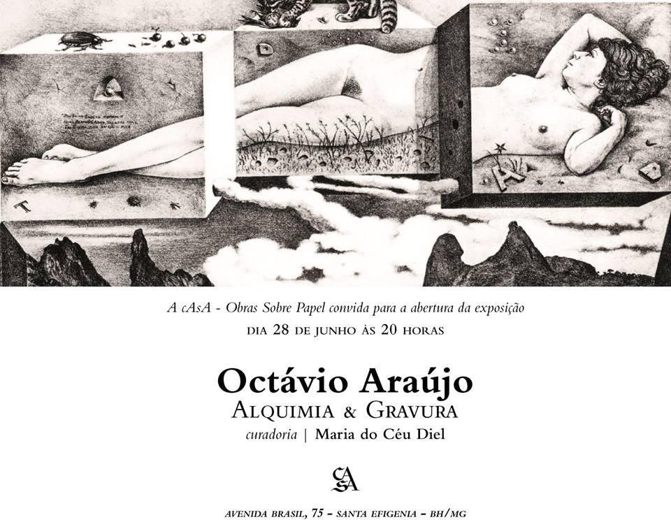 Porém, são também presentes nos trabalhos de Octávio Araújo as transformações alquímicas: Deméter deixa-se cobrir de rochas e seu corpo fecunda a terra e sustenta a civilização; ânforas de longo colo exibem líquidos coloridos; o ar, na forma de vento, arrasta nuvens e cortinas, trazendo a eletricidade dos raios e do curso das águas; o fogo, por sua vez, petrifica a pele das mulheres, dando-lhes a textura ígnea das pedras sagradas; Hipnos vela a noite e o sono faz o transporte para o mundo dos sonhos, do entendimento e da completude de nossa curta existência. Nos sonhos, tudo se subverte: a gravidade, a escala, o tempo, o espaço, os lugares…são imagens e ideias independentes, que devem conviver e atravessar os sentidos. São formulações e conjurações mágicas, que devem ser recitadas e observadas à meia luz. Octávio Araújo, em sua generosidade, deixa-nos vislumbrar, através da quarta parede de suas gravuras, um átimo destes lugares da memória, onde somos convidados a habitar enquanto durar o tempo da contemplação.