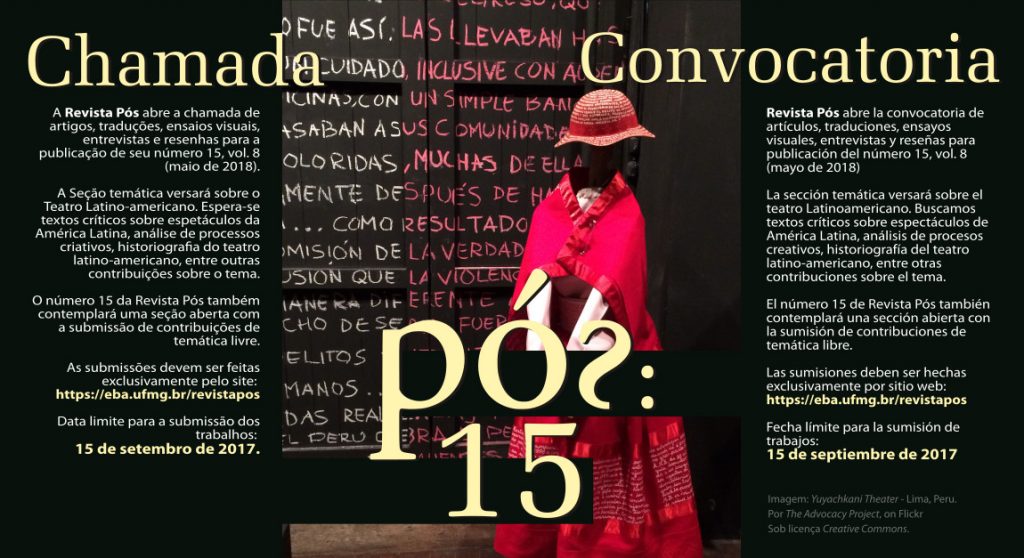Convocatória de Trabalhos Revista Pós n. 15 – Tema: Teatro Latino-americano. Prazo até 15 de setembro.