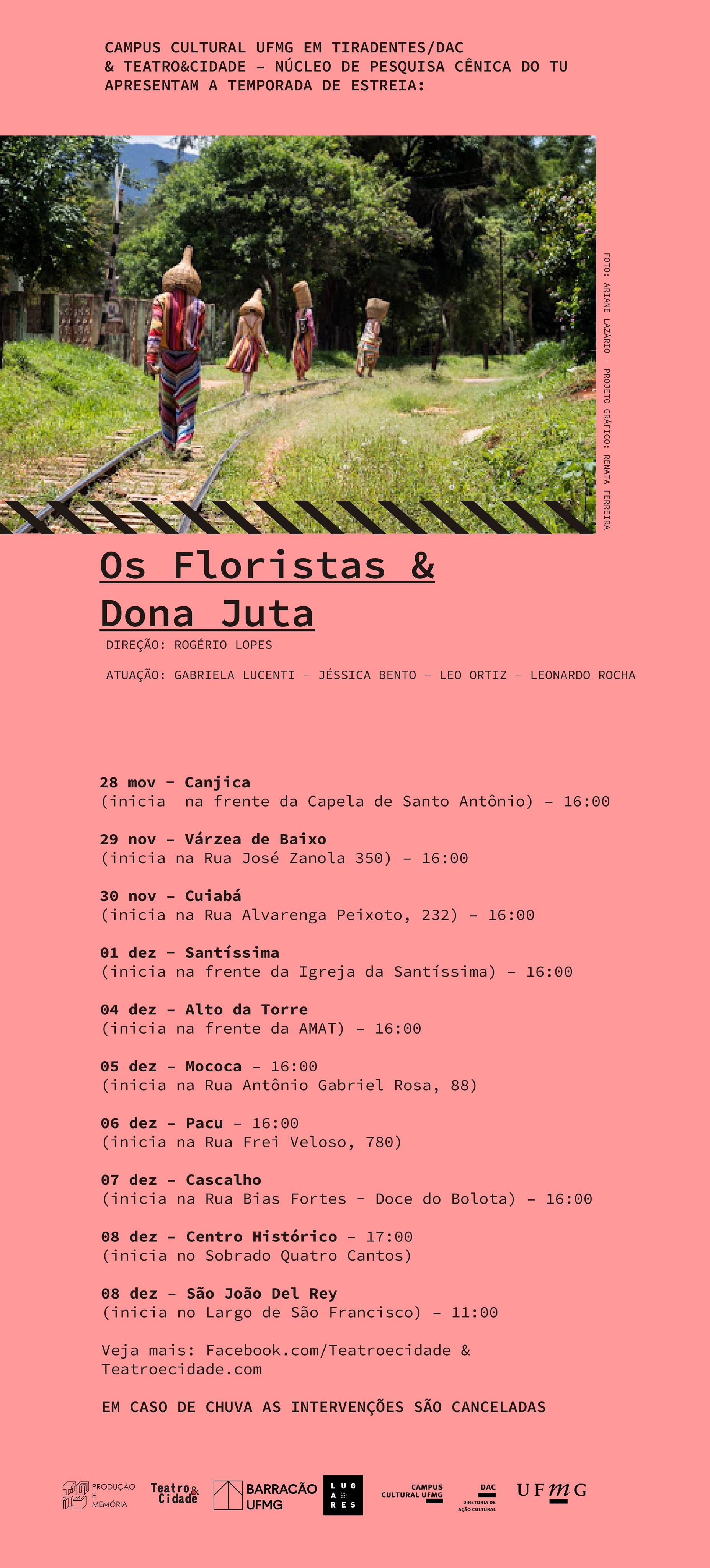 Embalados por acordes de sanfona, os Floristas passeiam pelas ruas e praças de Tiradentes e Dona Juta, por sua vez, brinca pela cidade, dando notícia de tudo que se passa ao seu redor. Os espetáculos são o resultado do projeto que percorreu nove bairros da cidade, realizando experimentos criativos. As peças dialogam com elementos do artesanato tradicional do Campo das Vertentes como cestaria, tecelagem manual e fibra de juta. A temporada em Tiradentes e São João del-Rei, é de 27 de novembro a 9 de dezembro. Também uma exposição sobre o projeto terá sua abertura, no Sobrado Quatro Cantos, no dia 7 de dezembro às 19h.
