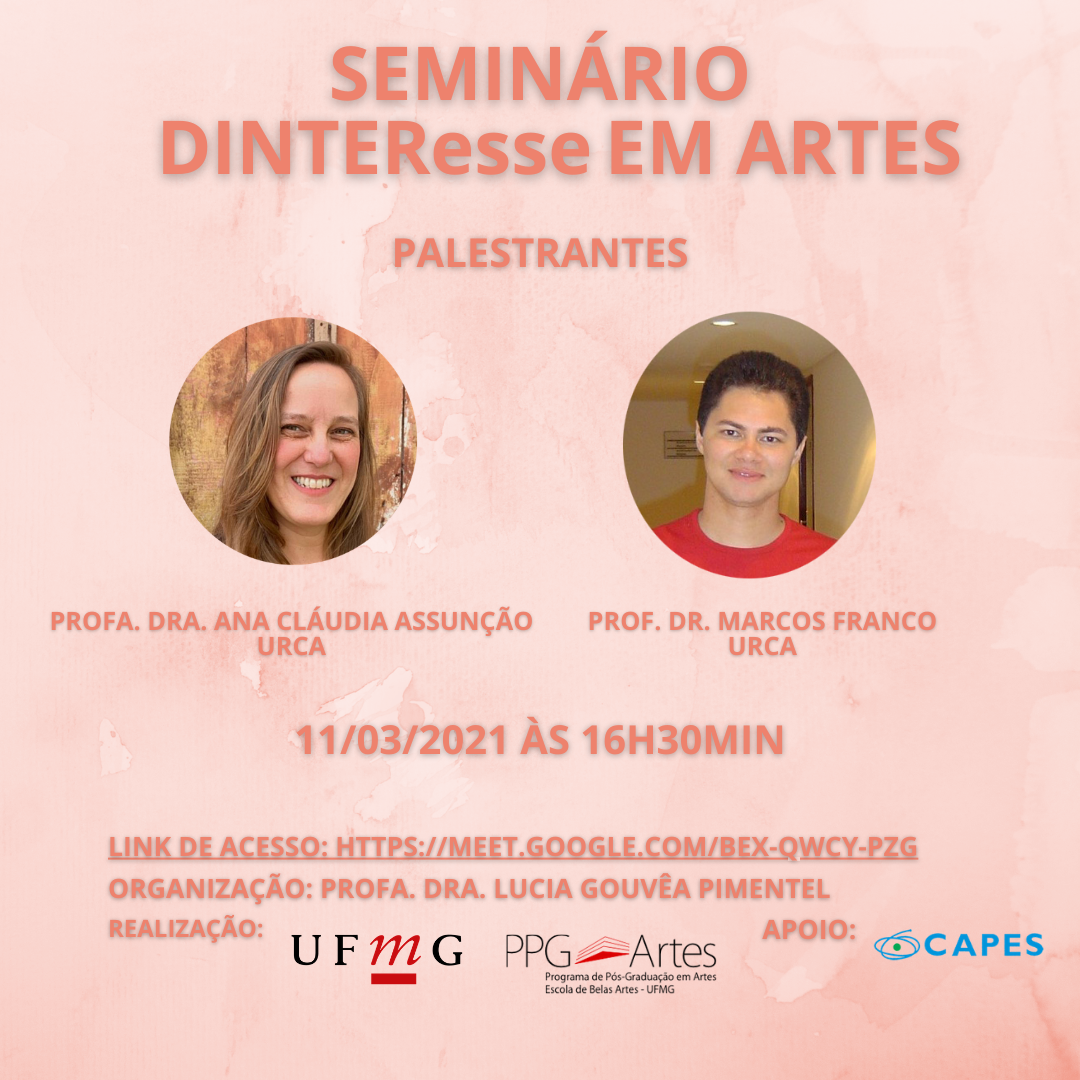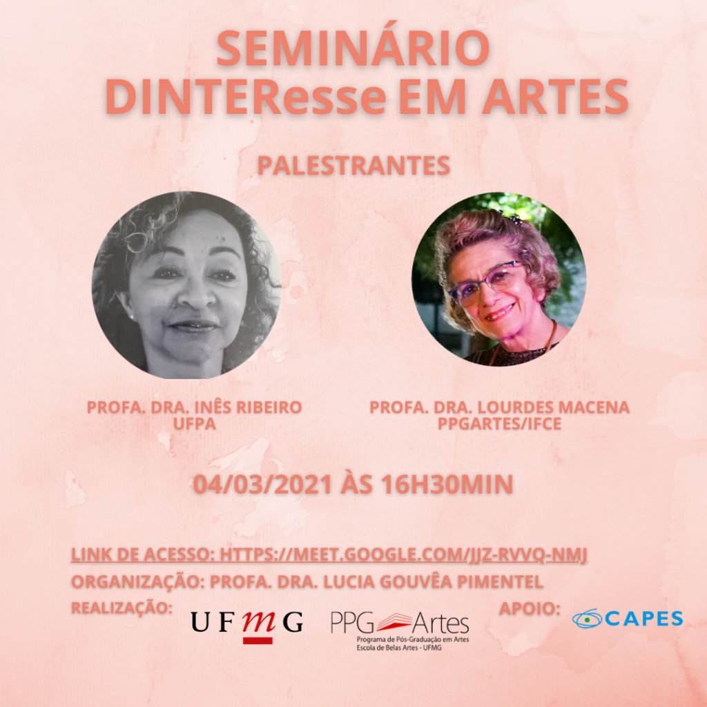 O Seminário DINTEResse em ARTES é realizado no google.meet e será emitido certificado para quem participar em, no mínimo, 70% das atividades. As próximas lives serão nos dias 04/03 e 11/03 de 16:30h às 18:00h.