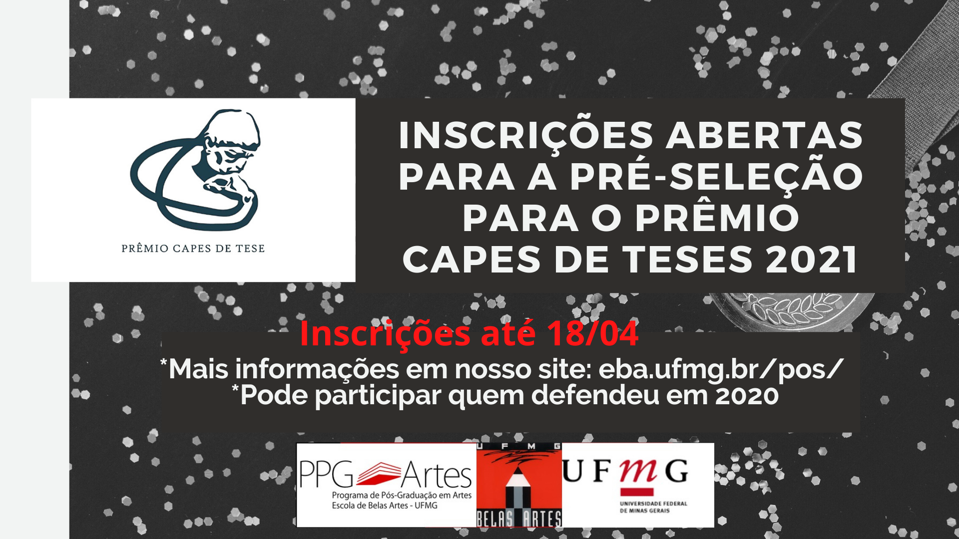 Importa esclarecer que uma comissão de professores do PPG Artes irá escolher uma tese e indicá-la para concorrer ao Prêmio CAPES e ao prêmio UFMG de Teses, conforme o Edital da CAPES – Prêmio Teses 2021
