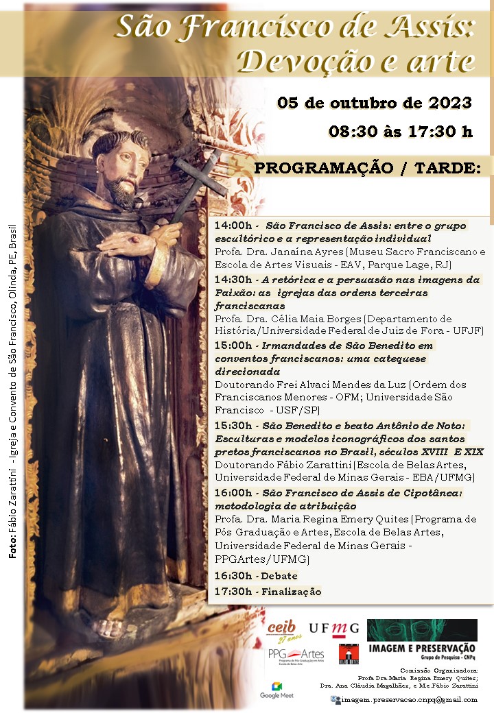 Neste 05 de outubro de 2023, em celebração do dia de São Francisco de Assis, foram reunidos dez comunicações orais no tema do franciscanismo e estudos afins. Com carga horária total de 08 horas, sua programação se divide em duas partes, manhã (08:30 ás 12h), e tarde (14 ás 18h). As comunicações abrangem temas como o patrimônio escultórico, espaços de devoção, elementos artísticos e arquitetônicos, iconografia e a preservação.A inscrição é gratúita e para requisição de certificado, basta preencher um formulário online no site do Ceib (http://ceib.org.br). Sejam Bem vindos!